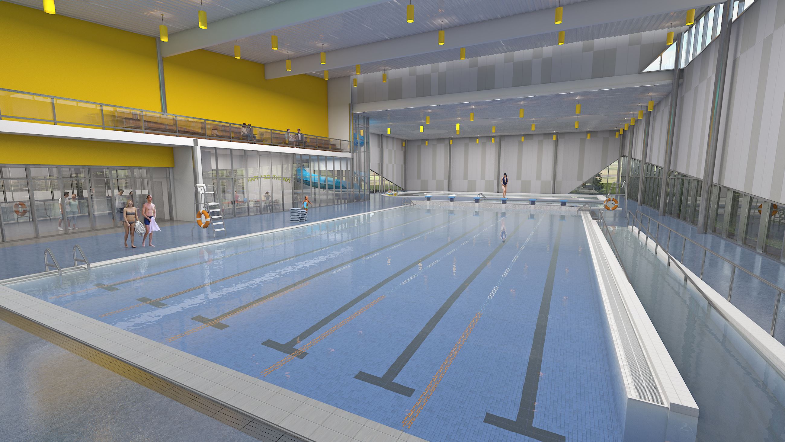 The indoor pool includes three separate pool tanks; a 25m lap pool, a leisure pool with lazy river, and an oversized spa that can double as a physiotherapy area. Each tank is provided with a barrier-free access ramp. Other rooms associated with the pool are a birthday party room and playhouse, either of which could be rented in conjunction with or independent of the pool. The playhouse is a two-story structure which will include several different activities appropriate for kids of various ages.
