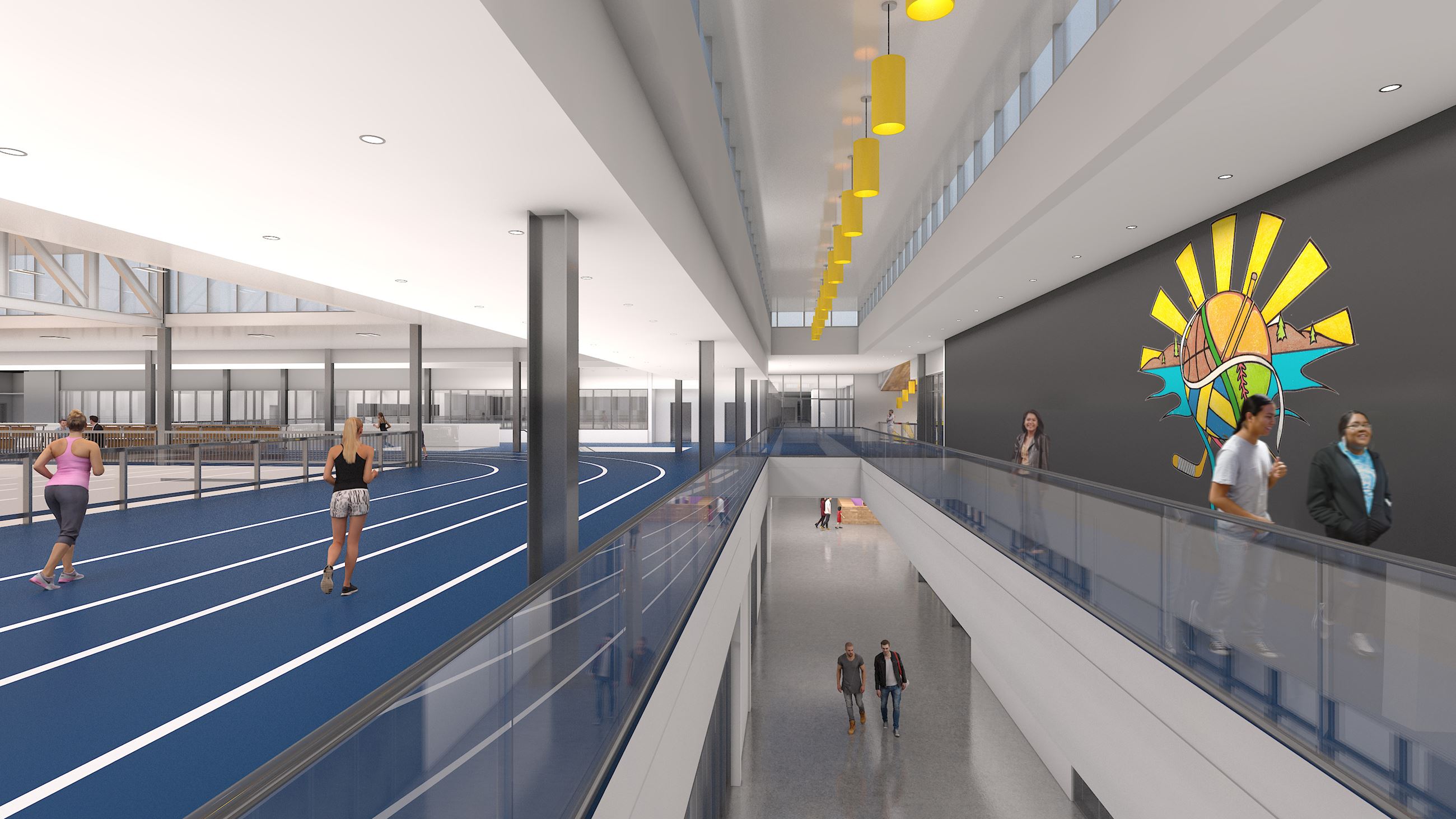 The gymnasium is sized to accommodate three regulation sized basketball courts, with enough space between each court for mobile bleachers systems to be installed for special events. The running track is located above, pulled back from the edge to allow space for additional tilt-and-roll type bleachers to be installed. Alternatively, the area can be used for stretching and other fitness activities. The roof over this space is raised to allow for clerestory glazing at roof level. This glazing will provide an abundance of natural light to the gym during the day.